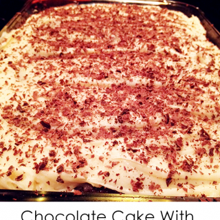 When the cake has completely cooled, you may add the icing to the top of it. To add a little pizzaz and flair, I actually took some Godiva Dark Chocolate and grated it on top.