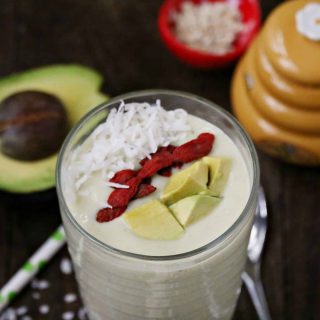 Add everything in a blender and drizzle some honey. Blend until smooth. Top with dried fruits, coconut flakes or even some extra diced up avocado. Drink right away.
