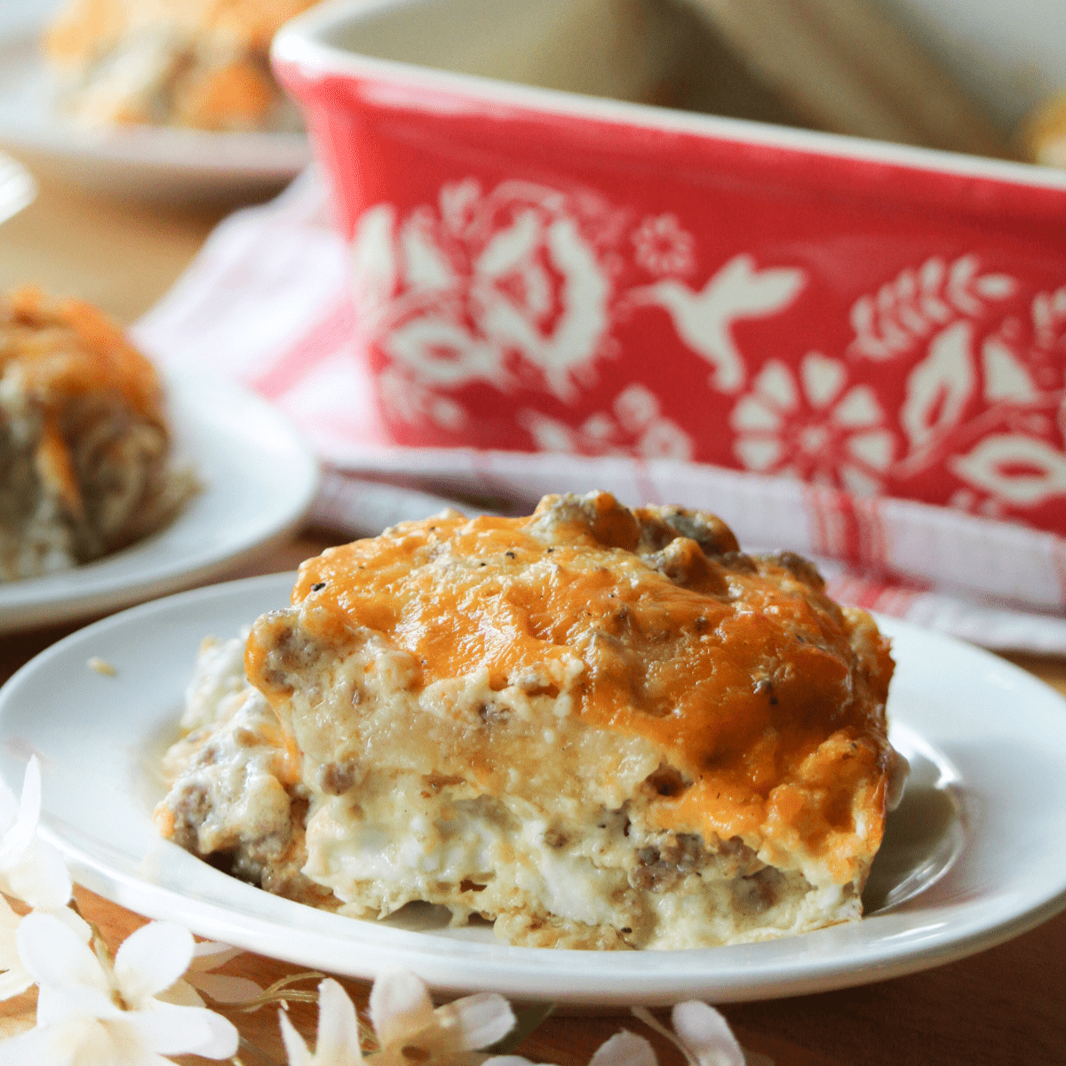 - Add the cheese in an even layer to the top of the biscuits, eggs, sausage and gravy in the pan. Bake for 30 minutes at 350F until golden brown. Remove from oven and allow to set for 5 minutes.