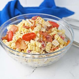 Chicken Bacon Ranch Pasta Salad is the perfect cold summer pasta salad that you can enjoy as a complete meal or side dish. Simply combine chopped chicken, juicy tomatoes, sweet red onion, crispy bacon, shredded cheese, and creamy ranch dressing.