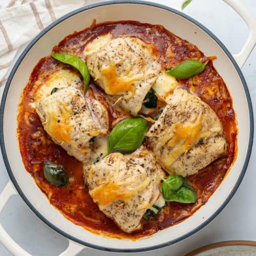 Make cozy chicken roll ups with ham, mozzarella, and spinach baked in marinara and finished with parmesan. Weeknight easy, melty, and crowd-pleasing.