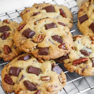 Lightly press cookies to flatten. Press the reserved 1⁄2 cup chocolate chunks and reserved 1/3 chopped pecans into tops of cookies.