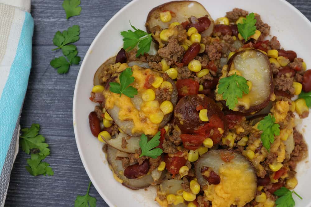 - In a 6 quart slow cooker, add cooked beef & all ingredients EXCEPT the cheese. Stir ingredients well to evenly distribute spices. Once done, Cover and cook on high for approximately 3 to 3 1/2 hours, or until potatoes are tender.