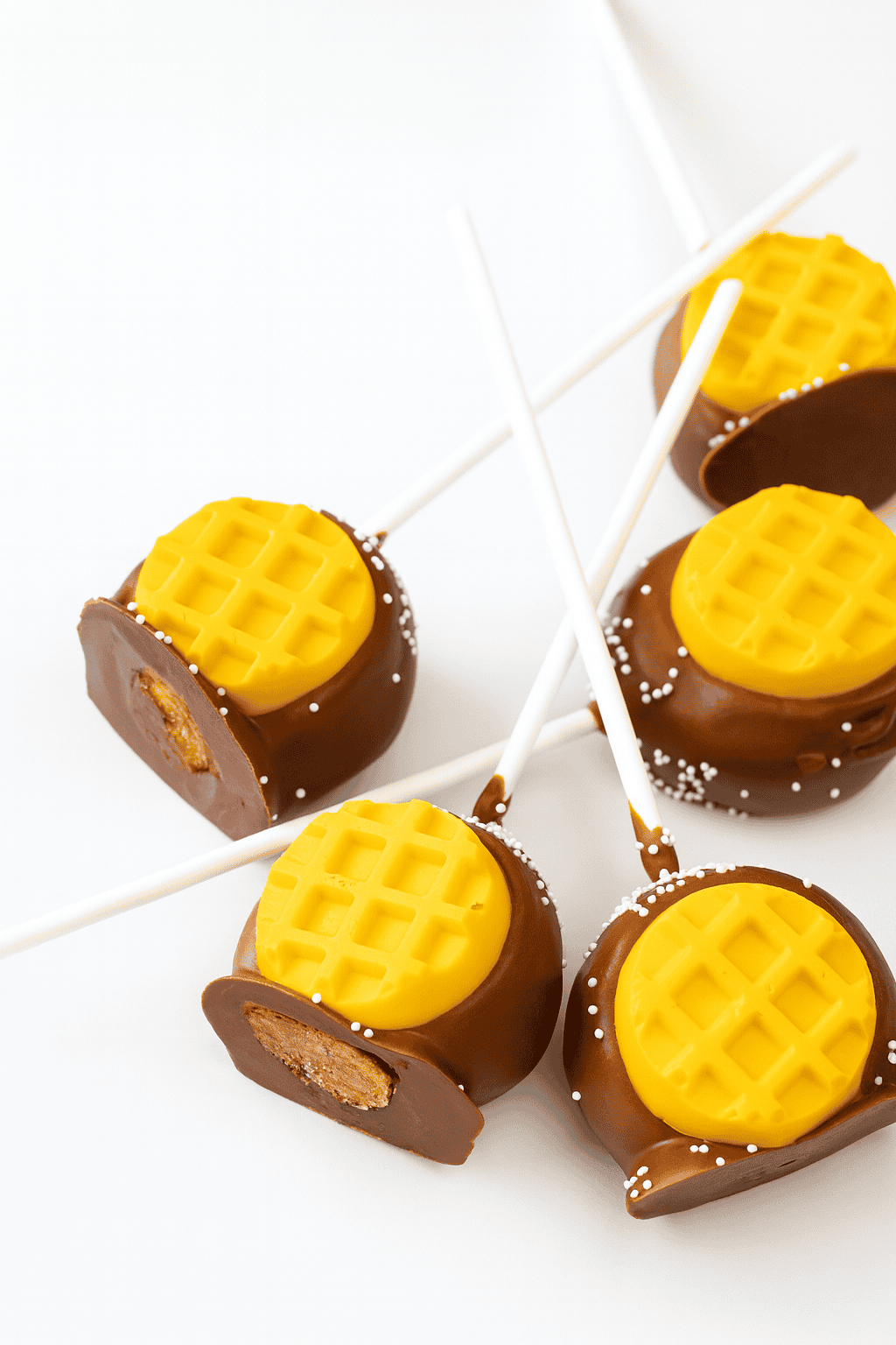 Final Touches: Place the drying cake pop on parchment paper. Gently press one of the yellow chocolate waffles onto the front of the cake pop and sprinkle with white nonpareil sprinkles before chocolate sets. Repeat until all your "Eggos" are ready!