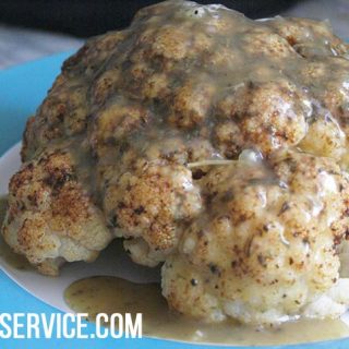 Remove trivet from Instant Pot. Once cauliflower is removed, press the sauté button. Using a whisk, add in your cornstarch slurry and allow to thicken. Pour gravy over cauliflower before serving.