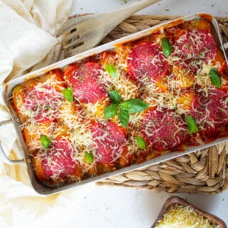 Stir to combine the mixture. Add the rest of the pepperoni slices and the shredded mozzarella over the top and cover with foil again. Bake for another 5 minutes in the oven or until the cheese melts.