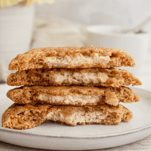 Take each ball of dough and flatten to a disc slightly larger than the cream cheese filling, place one dollop of cream cheese in the center of 2 flattened cookies and crimp the edges together to seal in the cream cheese. Roll the cookie in the sugar/spice mixture and place on a baking tray spaced 5” apart. Cookies will spread to about a 4-5” diameter while baking, so leave plenty of space!