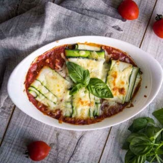Place zucchini ravioli in the dish and top with remaining mozzarella. Bake about 25 mins, until the cheese is melty and golden on top.