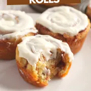 You get the same flavor and fluffy soft texture of traditional cinnamon rolls without the extra steps and time of baking with yeast or having to let your dough rise before popping the beauties into the oven!
